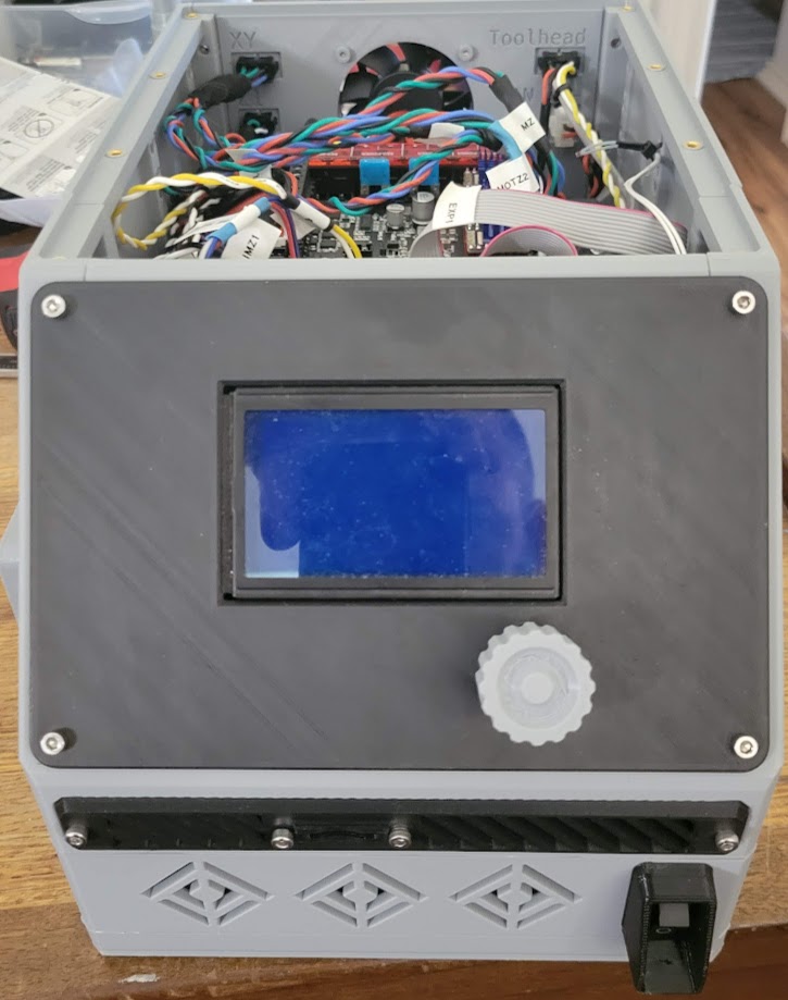 Front view of a completed OmniBox with power switch cover and rear-mounted 60mm fan.